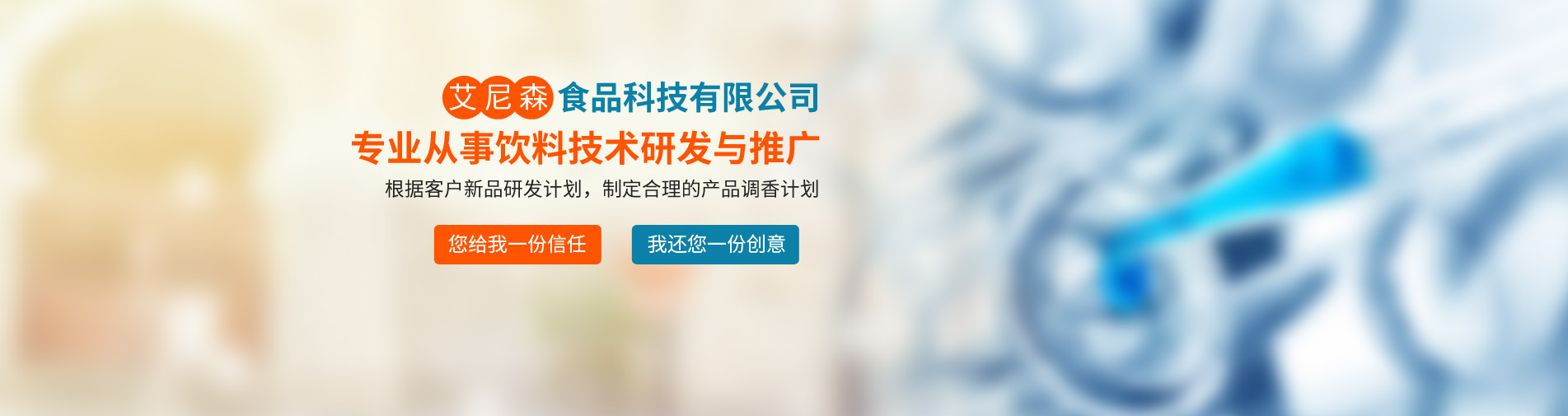 廊坊市艾尼森食品科技公司是一家專業(yè)從事飲料技術研發(fā)與推廣的公司,公司業(yè)務主要包括食品飲料技術咨詢與服務、產品定位與現(xiàn)有產品品質改進、新產品技術工藝研發(fā)等。公司坐落于京津冀核心地帶--廊坊市,位置得天獨厚,現(xiàn)與京津多家研究所形成戰(zhàn)略合作關系,為多家上市公司及知名企業(yè)提供技術支持與原材料供應。